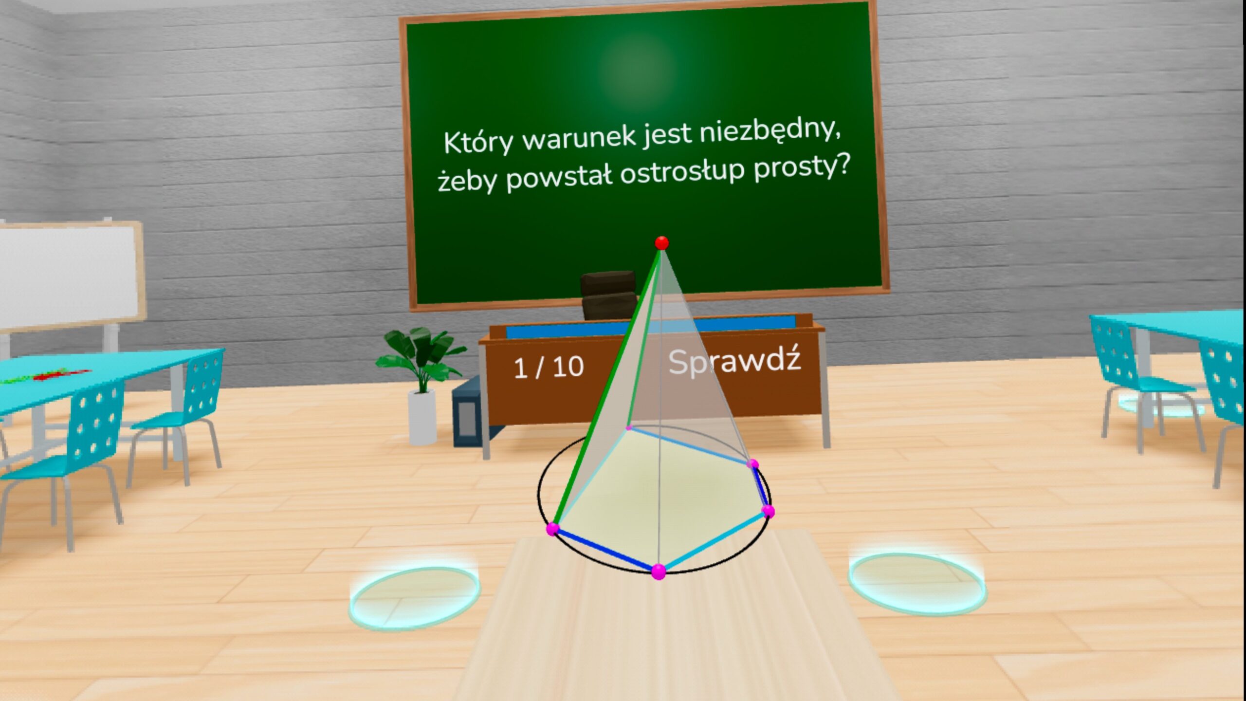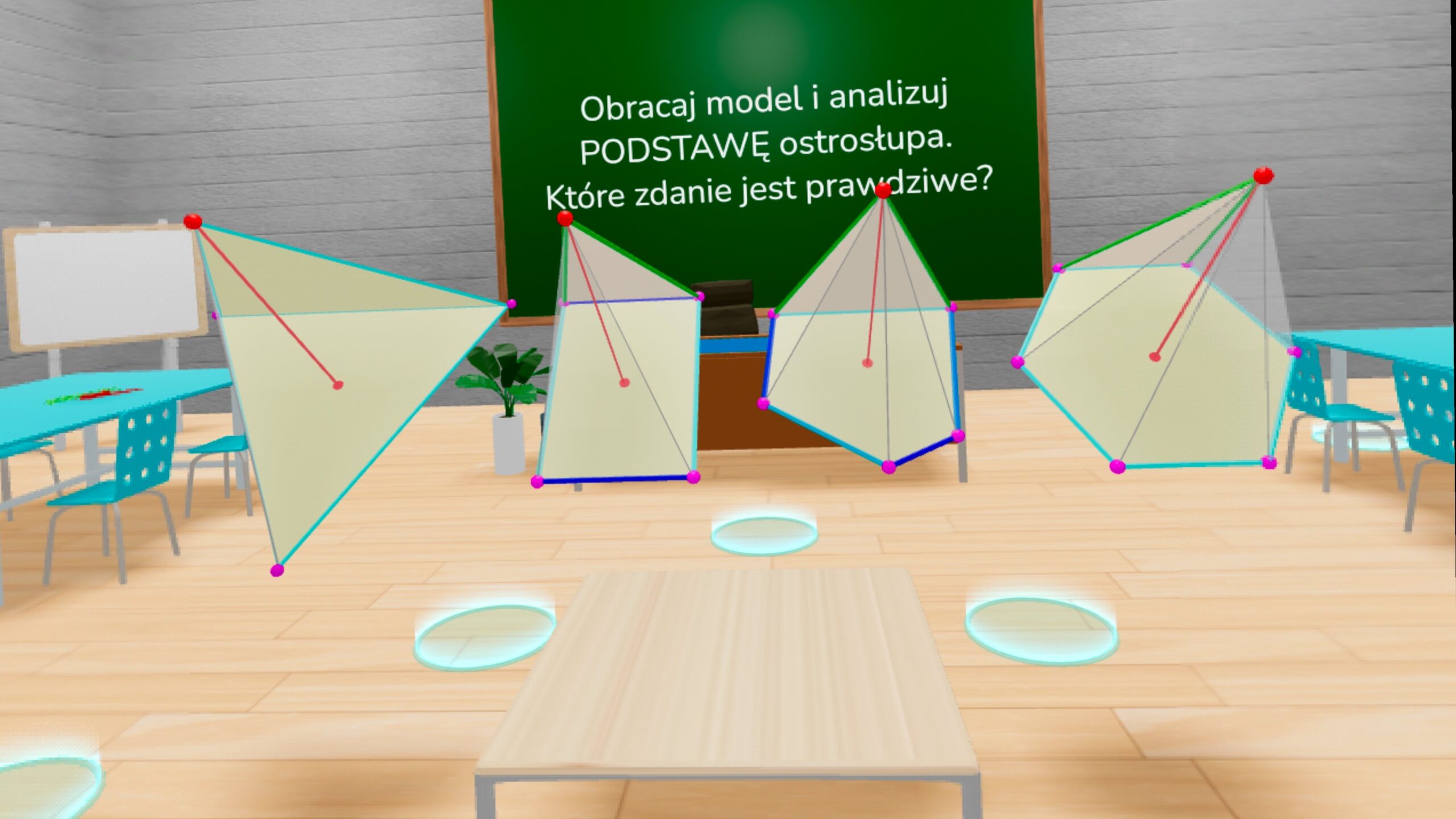 QUIZY VR: Bryły 3D dla klas 7-8: W klasach 7–8 quizy VR rozwijają wcześniejsze doświadczenia i przechodzą do bardziej świadomej analizy zależności między elementami brył. Umożliwiają pracę na bardziej złożonych modelach oraz formułowanie i sprawdzanie reguł opisujących budowę brył. W tej części VR pełni rolę środowiska do analizy i wnioskowania. Model 3D nie jest jedynie ilustracją, ale staje się narzędziem do rozumienia geometrii.