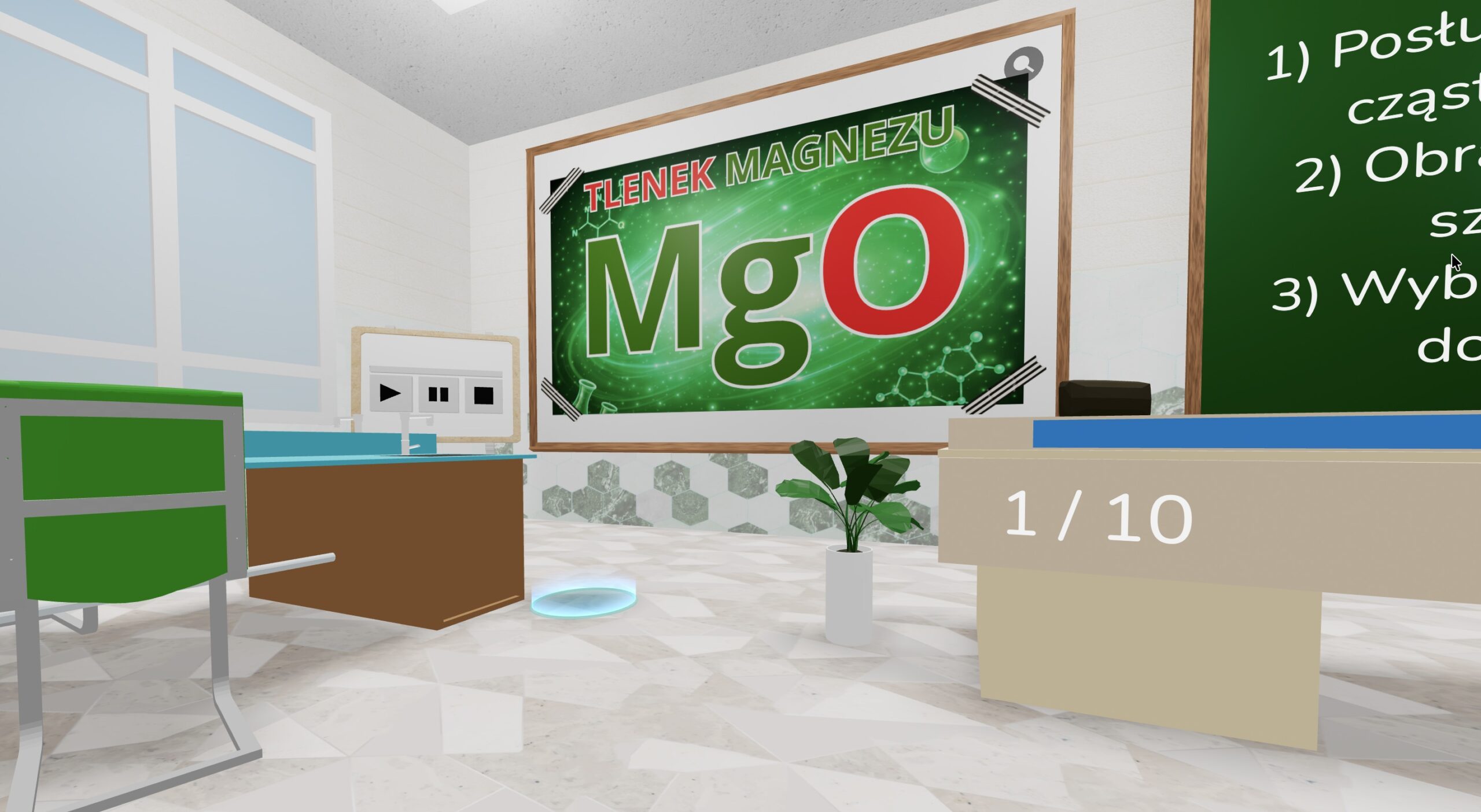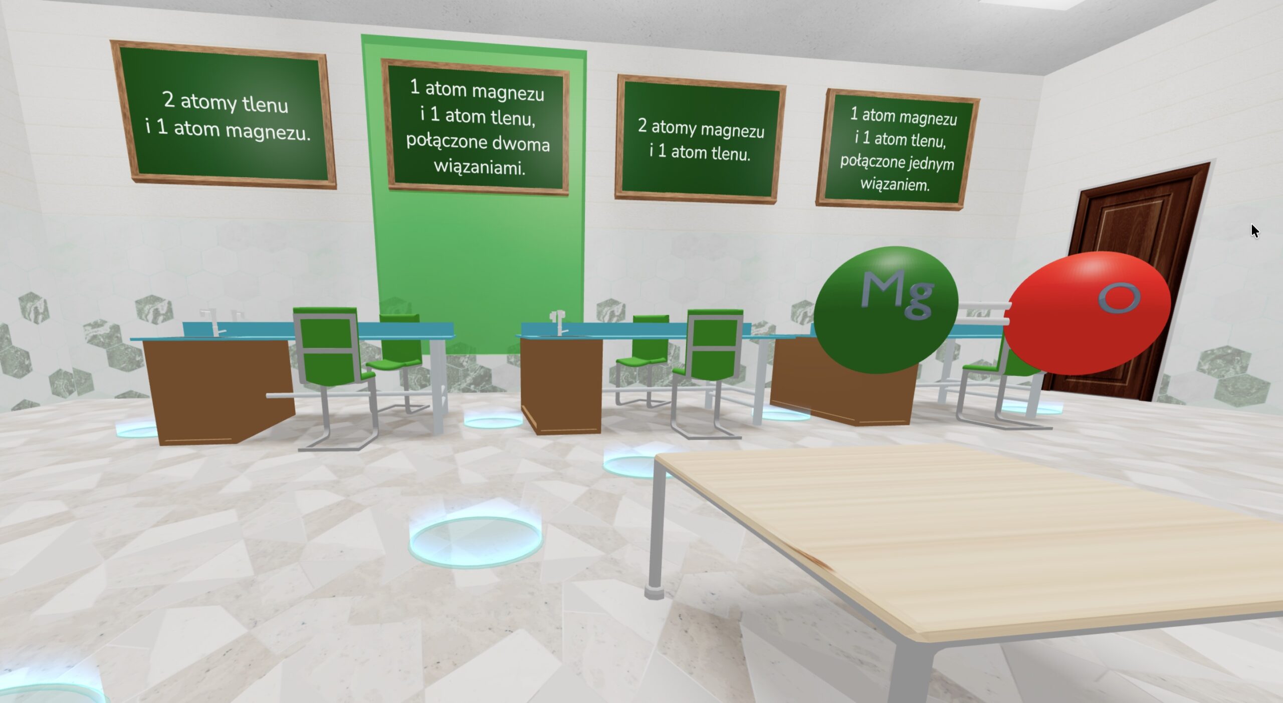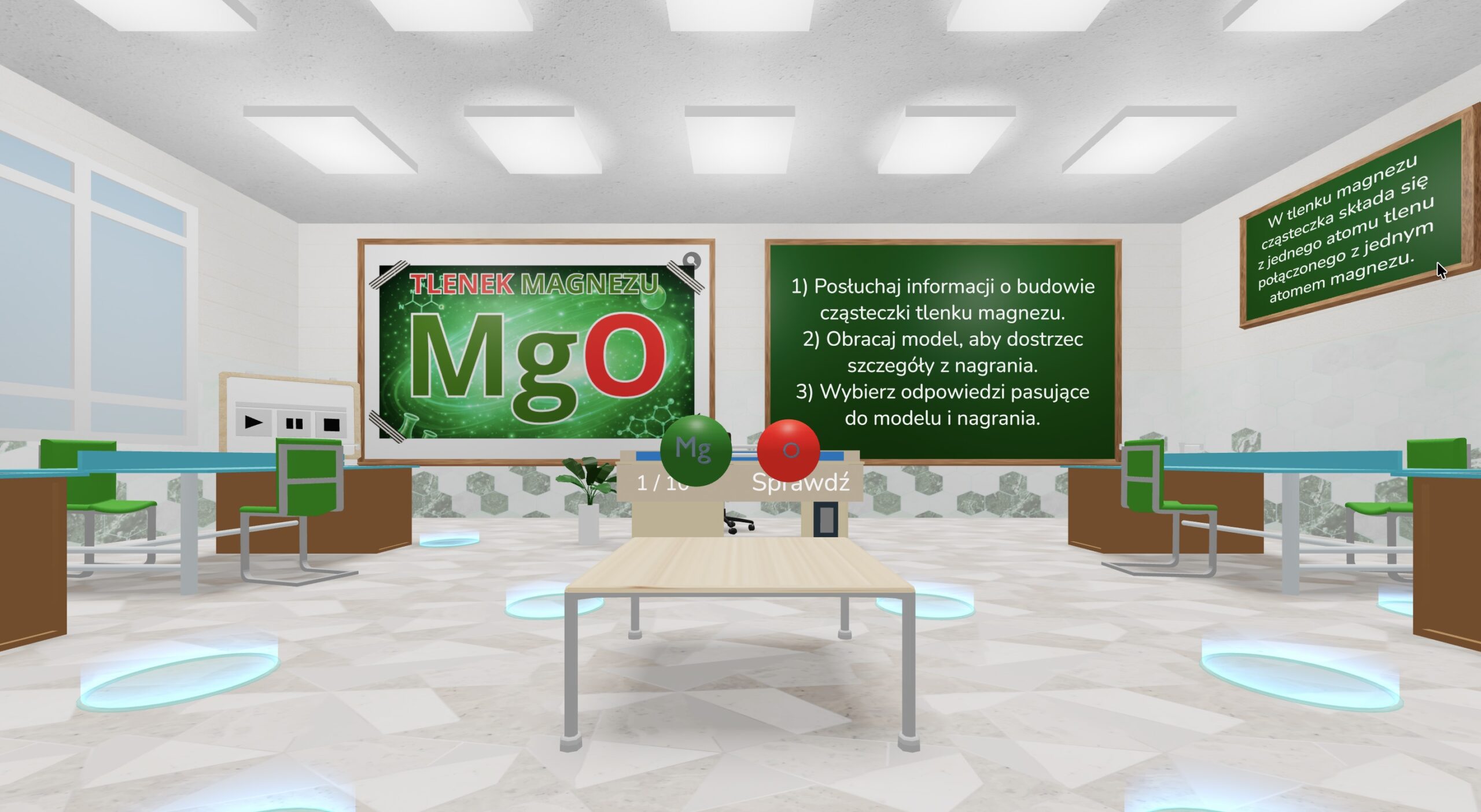 - quizy VR dla klas 7–8, stanowiące główną część programu, obejmujące m.in.: obserwację cząsteczek w przestrzeni 3D, manipulowanie modelami, słuchanie opisów audio, rozpoznawanie typów związków (tlenki, wodorotlenki, kwasy, sole, węglowodory) oraz analizę ich budowy i zależności między wartościowością a wzorem,
