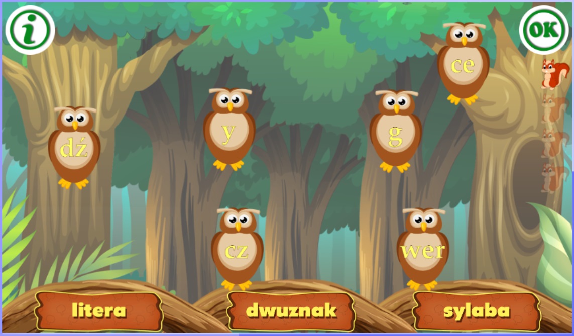 - Nauka alfabetu, czytania, pisania, sylaby, rodzaje głosek. Zadania i quizy przeznaczone do nauki liter polskiego alfabetu, polegające na rozpoznawaniu liter, dopasowywaniu odpowiednich małych i wielkich liter, poznawaniu pisowni wyrazów, a także na układaniu wyrazów z podanych literek. Nauka czytania w oparciu o sylaby, dzielenie wyrazów na sylaby, rozpoznawanie samogłosek i spółgłosek.