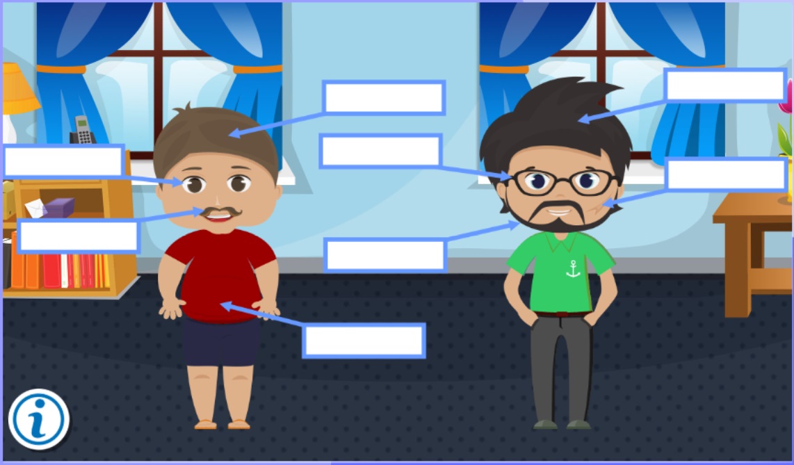 - Poznanie nazw części ciała. Zadaniem ucznia jest kliknięcie w części ciała postaci i zapoznanie się z ich nazwą i wymową w języku angielskim, Słownictwo wykorzystane w quizie: eye, ear, nose, hair, head, leg, stomach, neck, arm, finger, toe, chest, shoulder, elbow, knee, wrist, ankle, teeth.