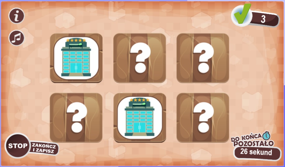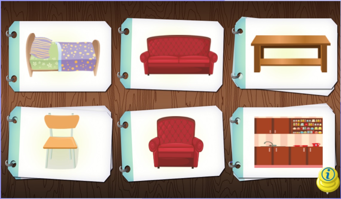 - Gra typu memory. Uczeń utrwala nazwy pomieszczeń w domu w języku angielskim. Zadaniem ucznia jest odkrywanie kart i łączenie w pary tych, które przedstawiają ten sam obrazek. W przypadku odnalezienia pary uczeń usłyszy poprawną wymowę wyrazu. Każda runda gry ma określony czas!