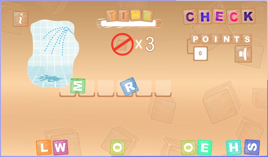 - Układanie angielskich słów z liter. Uczeń ćwiczy pisownię nazw mebli w języku angielskim. Zadaniem ucznia jest ułożenie z klocków nazw pokazanych mebli. Na wykonanie wszystkich zadań uczeń ma określoną ilość czasu! Słówka w grze: bed, sofa, table, chair, armchair, cupboard, computer, TV, lamp, window, door, wardrobe, bookcase, bookshelf, carpet, rug, curtains, floor, wall, poster, painting, washbasin, shower, bath, sink, fridge, cooker, dishwasher.