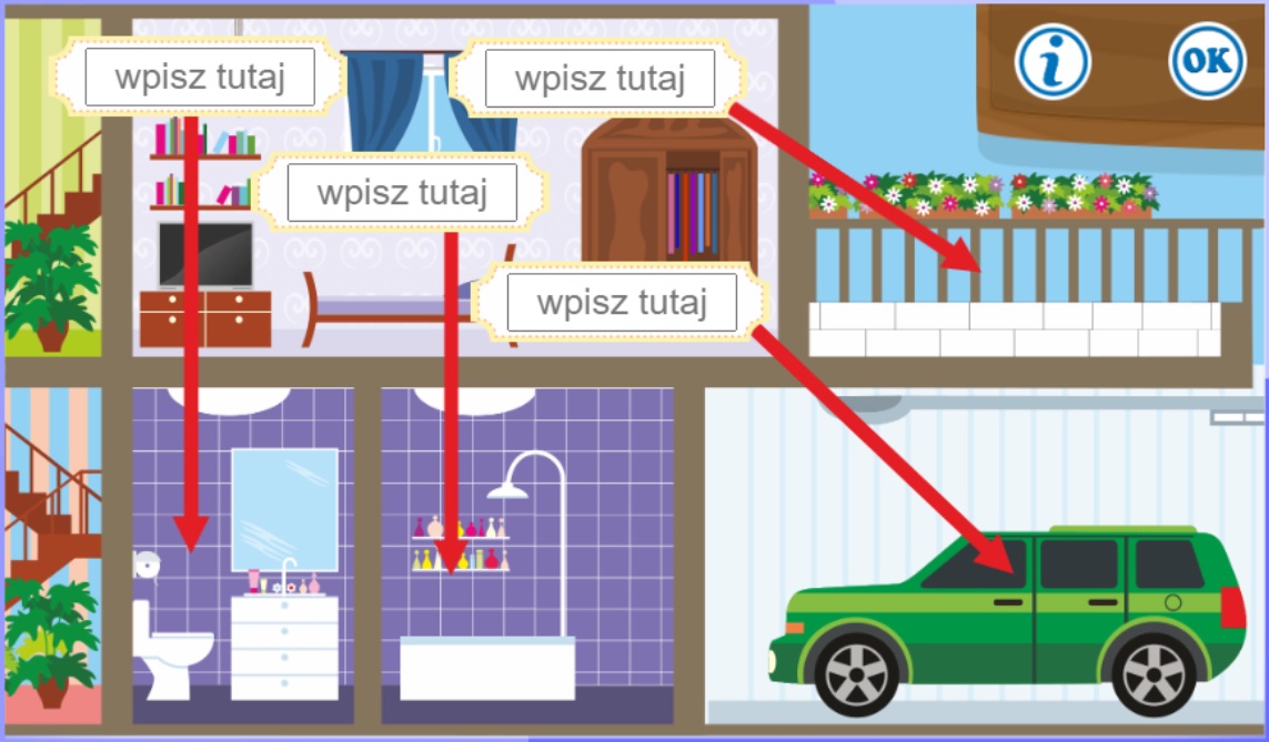 - Nazwy pomieszczeń: living room, bedroom, bathroom, toilet, garden, kitchen, dining room, hall, attic, basement, garage, balcony.