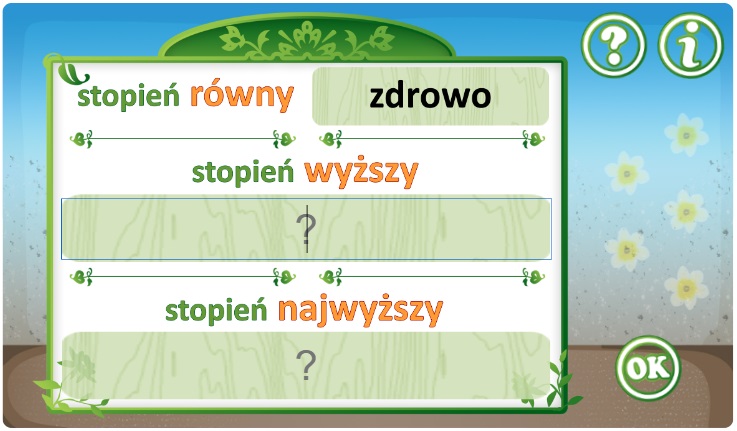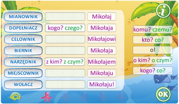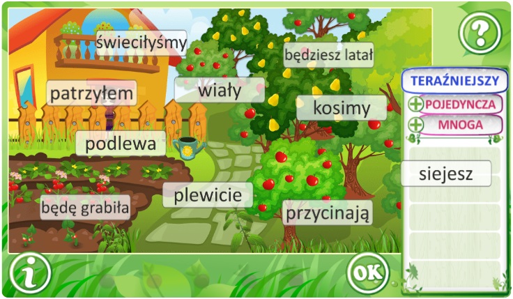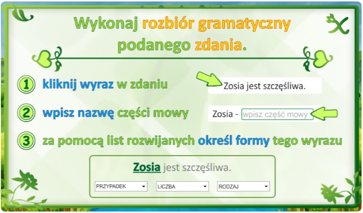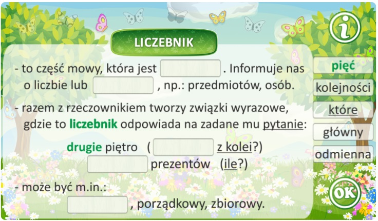 Zestaw interaktywnych quizów, których przedmiotem są rzeczowniki, czasowniki, przymiotniki, liczebniki i zaimków. Rzeczowniki są tu prawdziwymi bohaterami, a niektóre z nich zasługują nawet na wielką literę! Czasowniki prezentują swoje formy, od tych podstawowych po te ukrywające się w trybach i stronie biernej. Przymiotniki malują obraz świata, a liczebniki kształtują liczebność i kolejność. Zaimki, jak niewidzialni pomocnicy, pełnią swoje funkcje w językowej układance. Nasze interaktywne quizy, łamigłówki i inne zadania uczynią naukę odmiennych części mowy łatwą i przyjemną.