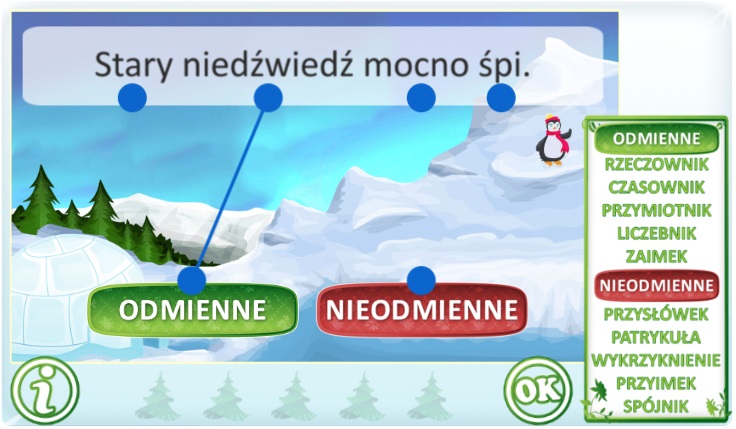Po rozwiązaniu quizów interaktywnych z programu Rozpoznawanie części mowy”, w sekcjach odmienne i nieodmienne części mowy, uczniowie będą z łatwością mogli udzielić odpowiedzi na pytania zawarte w tych sekcjach.
